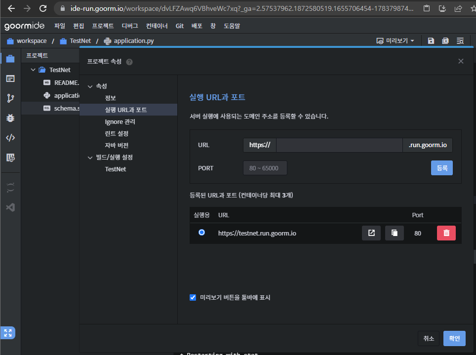 참고로 구름IDE에서 도메인을 설정하는 방법은 오른쪽 상단 "미리보기" 메뉴에서 실행URL과 포트설정을 눌러서 원하는 도메인으로 바꾸면 위와 같은 도메인을 사용할 수 있다.