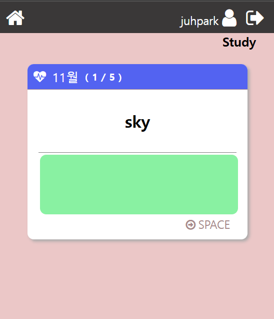 클릭, Enter, Space 등으로 해당카드를 선택하면, 가려진 녹색 창이 사라지고 뜻이 나오고 한번더 선택하면 카드가 왼쪽으로 사라지고 오른쪽에서 다음카드가 나타난다.