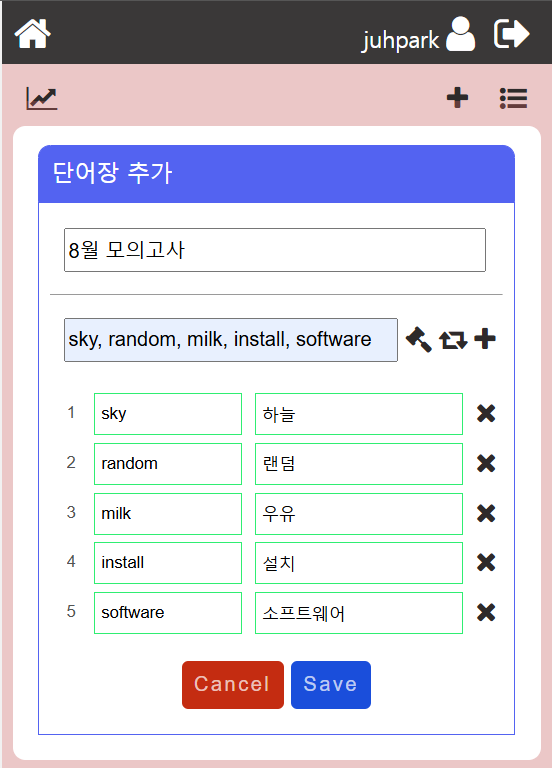 단어와 뜻을 다 입력한 뒤, 저장 버튼을 구현하였다. 저장하는 내용은 제목(8월 모의고사)과 영단어와 뜻 목록을 데이터로 담아서 $.post 로 데이터를 전송하면 된다.아래는 save 버튼 클릭시 발생하는 이벤트 구현소스이다.$('.save-btn').click(function(){ if ($('.add_element').val() == ""){ alert("단어장 제목을 입력하세요.") $('.add_element').focus() return } var wm = $('.word_mean') if(wm.length == 0){ alert("입력된 단어가 없습니다.") return } ..