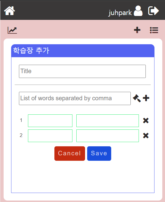 데이터베이스 설계 이후, 여러가지 일로 좀 많은 시간이 걸렸다. 어떻게 하면 좀더 편하게 단어를 입력할 수 있을까 하는 고민을 상당시간 하였고, 날 코딩으로 화면을 구성하는 것이 쉽지 않아서 시간이 좀 많이 걸렸다.설계를 완료하고 위의 이미지와 같은 방식으로 화면 구성을 하였다. 툴바의 + 버튼을 클릭하면 "학습창 추가" 화면이 보여지게 되고 순서대로 자료를 입력하면 된다.제목입력 이후, 두번째 필드에는 콤마(,)로 분리된 영어단어 리스트를 입력한 뒤, 망치 버튼을 클릭하면 아래쪽에 입력된 단어들이 표시가 되게 되게 만들었다. 오른쪽에 + 버튼을 클릭시 한개씩 단어를 아래쪽에 추가할 수 있고, X 버튼을 클릭하면 해당 단어가 삭제가 된다.망치를 클릭할때, 단어가 자동으로 펼쳐지게 되고, 구글 번역 API..